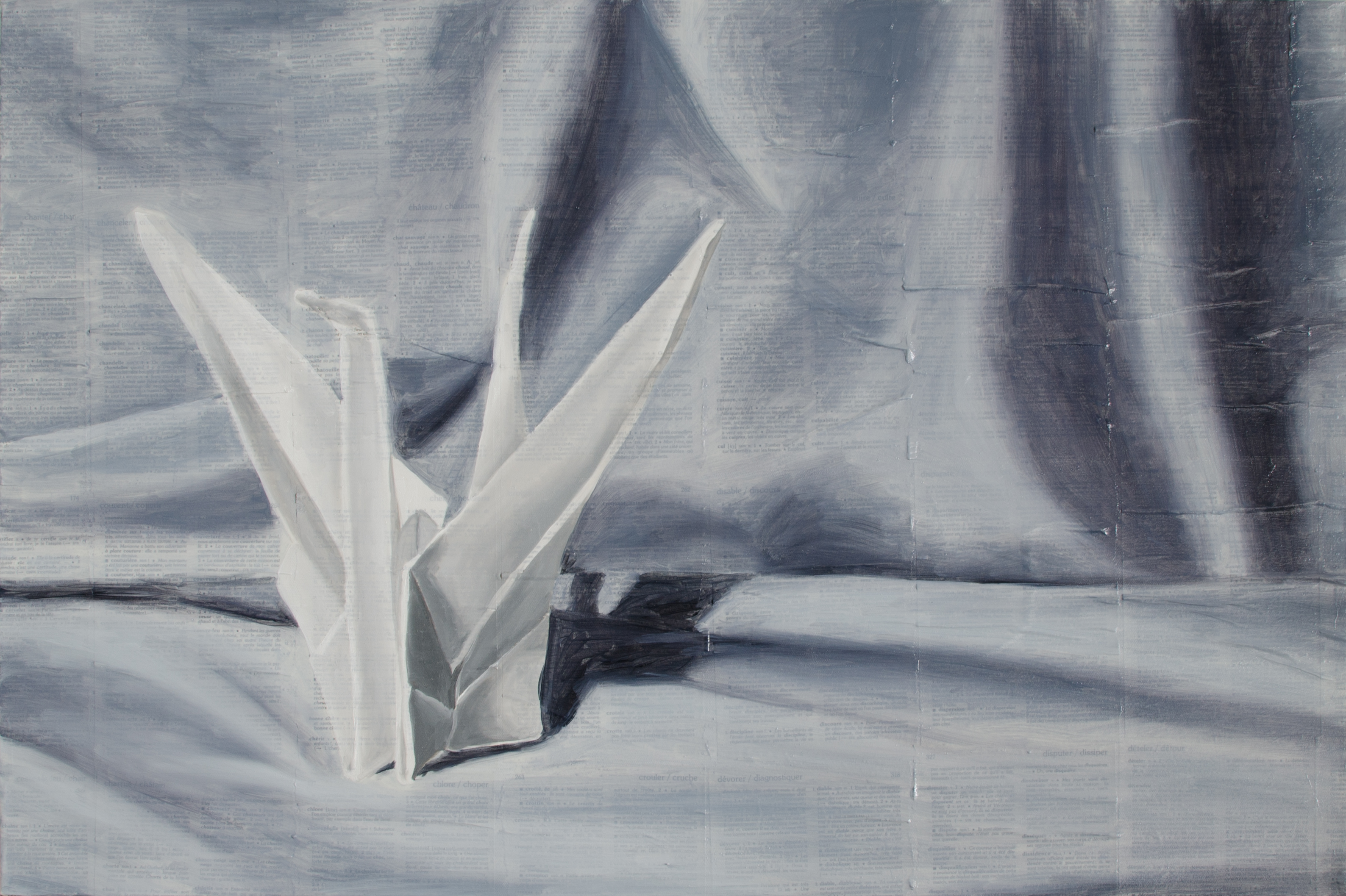 Spent a little more time working on this one. I want some of the book paper to show through in the background, so I am working with chromatic black and zinc white for drapery as they are more transparent than the ivory black and titanium white I usually work with – and used for the crane. I combined them with a generous amount of linseed oil to work with them as glazes. It needs a lot of work yet and I have to decide how much I want to show through. Still a work in progress…